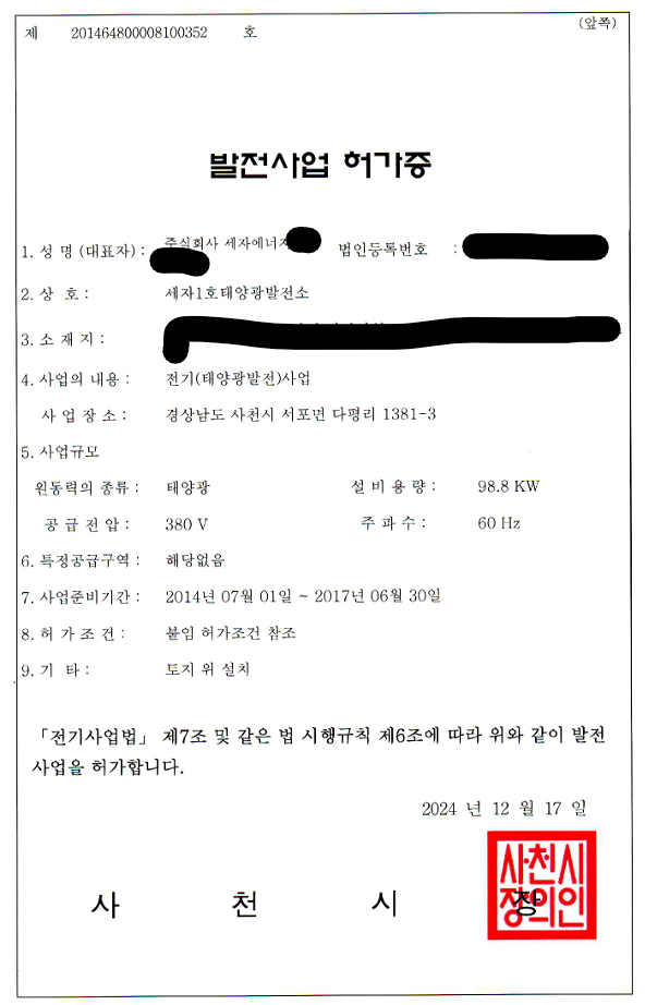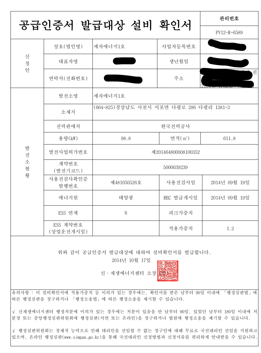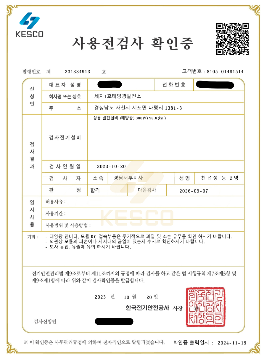 설비확인서 / 발전사업 허가증 / 사용전 검사